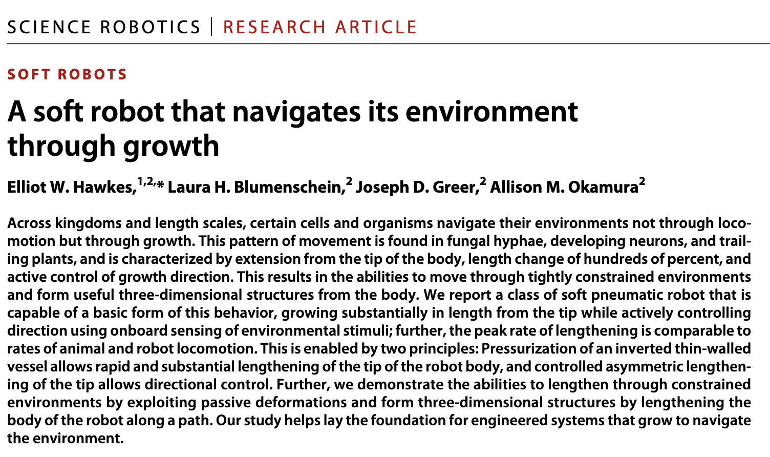 “a soft pneumatic robot that is capable of growing substantially in length from the tip while actively controlling direction using onboard sensing of environmental stimuli”